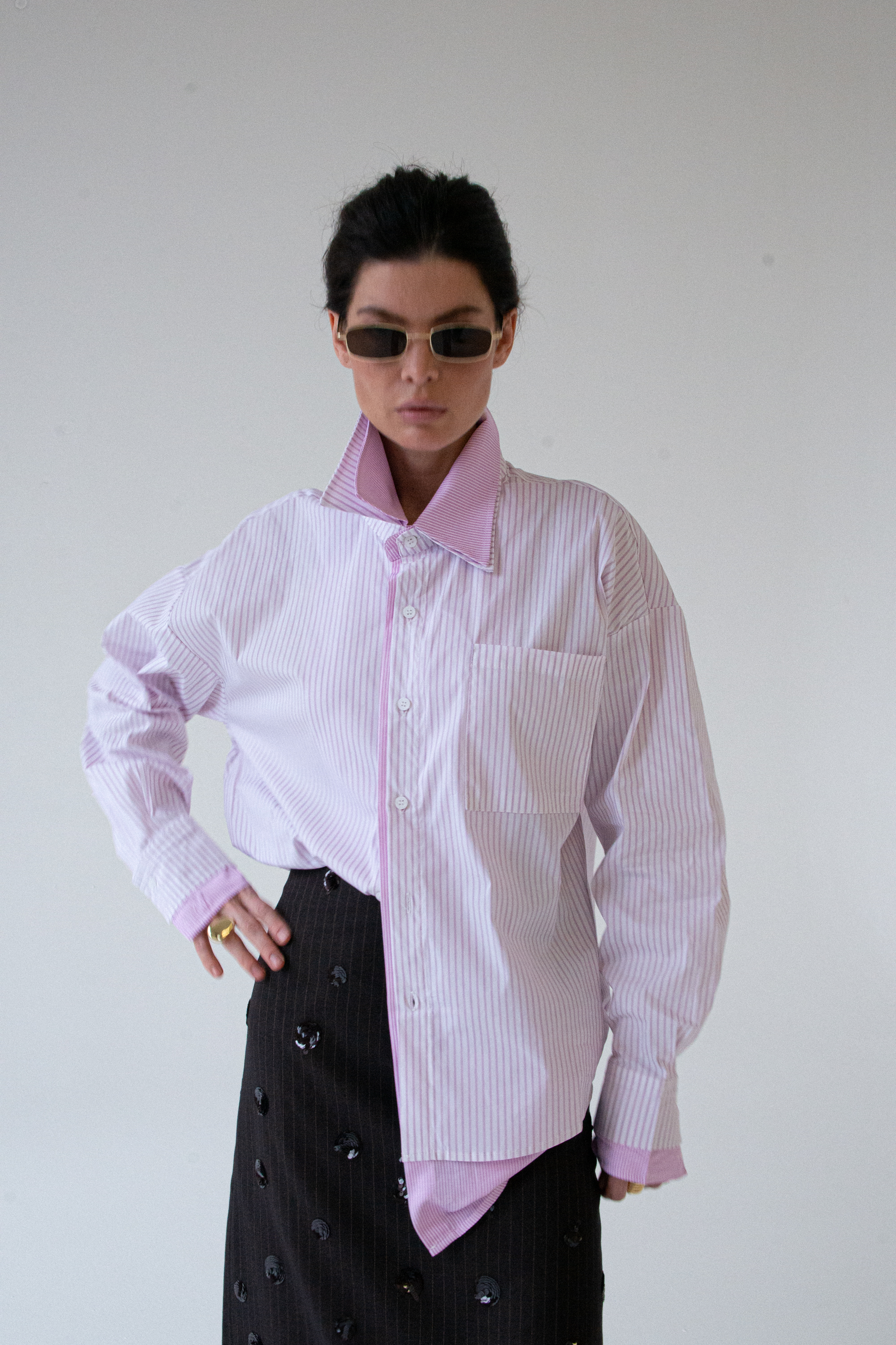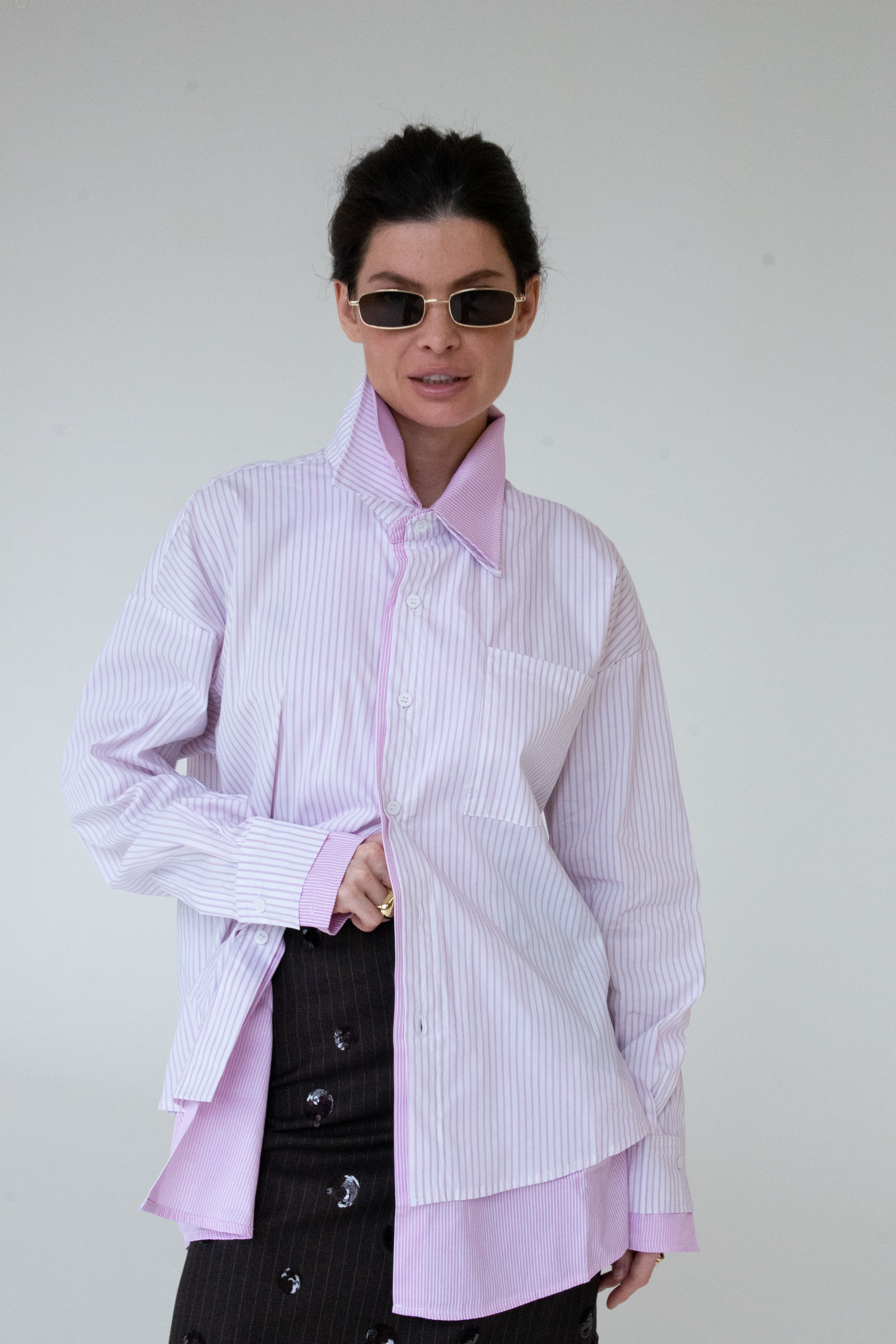 Свободная рубашка oversize с акцентом на нижний контрастный слой. Классическая голубая полоска получает новое прочтение: модель выглядит многослойной, но остаётся лёгкой и комфортной.